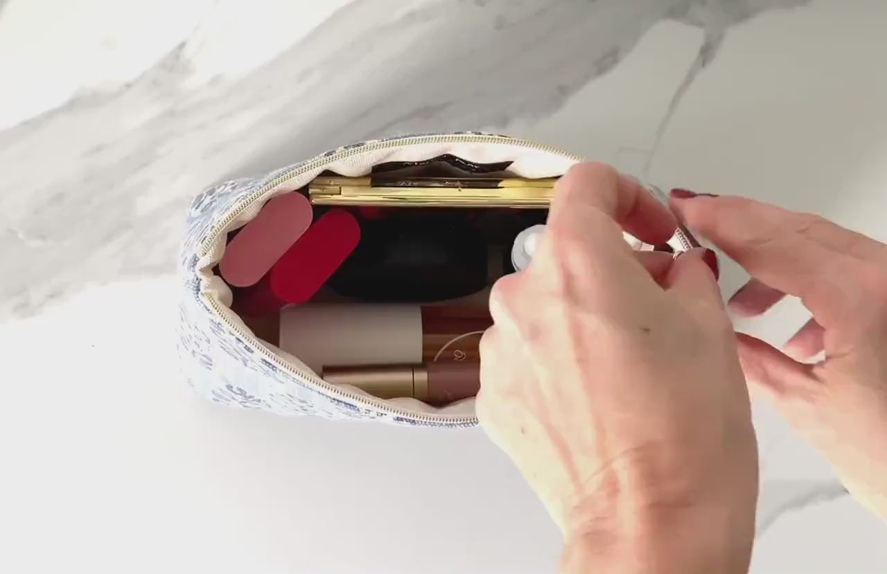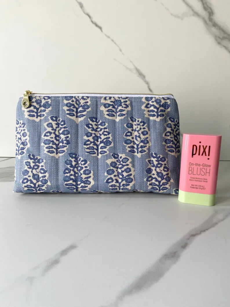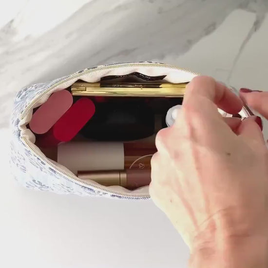 Generously sized quilted cosmetic bag keeps your items secure and organized. Handmade with quilted cotton canvas with a layer of batting making this a firm and structured bag. Use it for your cosmetic needs, travel toiletries, feminine products and hair and nail supplies.