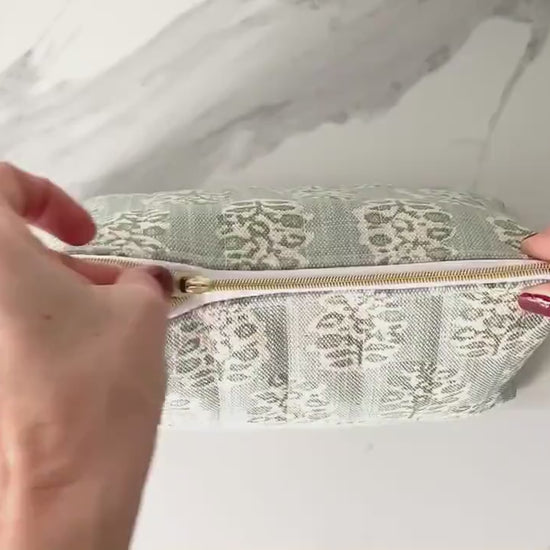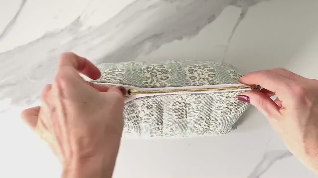 Generously sized quilted cosmetic bag keeps your items secure and organized. Handmade with quilted cotton canvas with a layer of batting making this a firm and structured bag. Use it for your cosmetic needs, travel toiletries, feminine products and hair and nail supplies.