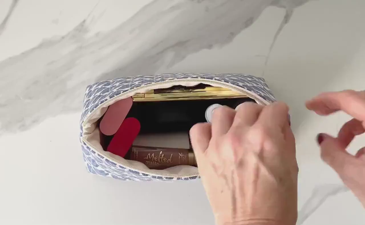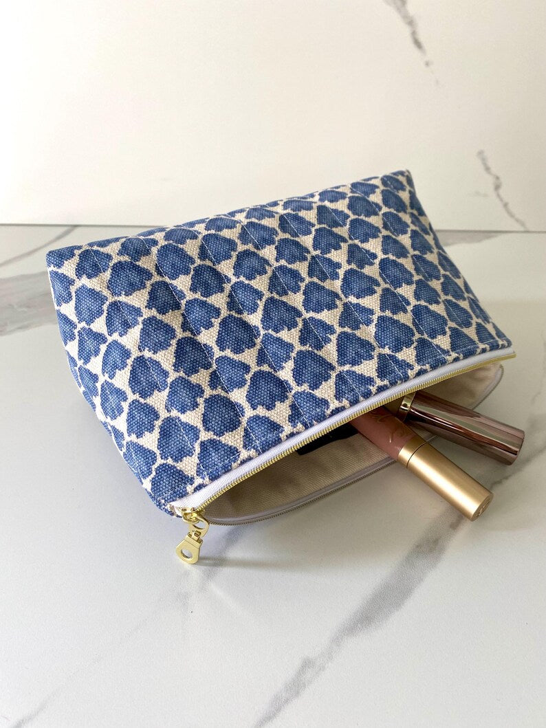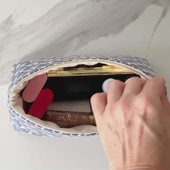Generously sized quilted cosmetic bag keeps your items secure and organized. Handmade with quilted cotton canvas with a layer of batting making this a firm and structured bag. Use it for your cosmetic needs, travel toiletries, feminine products and hair and nail supplies.