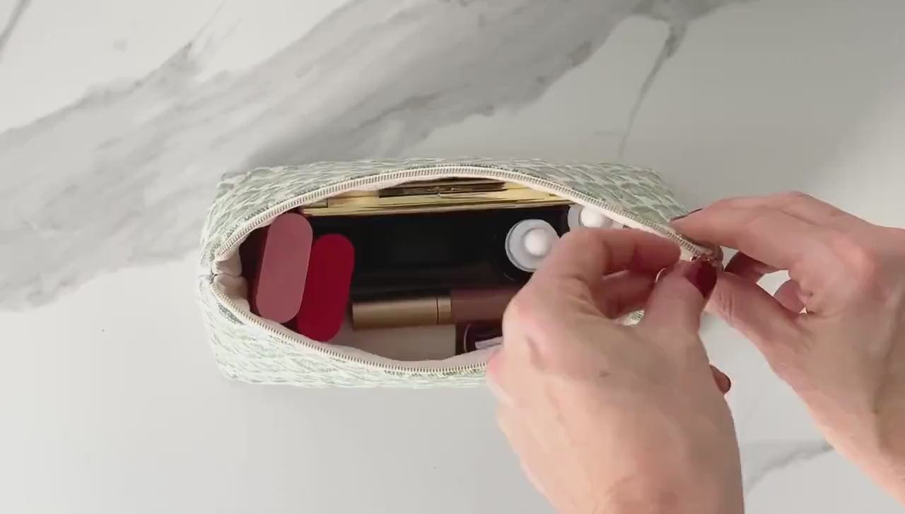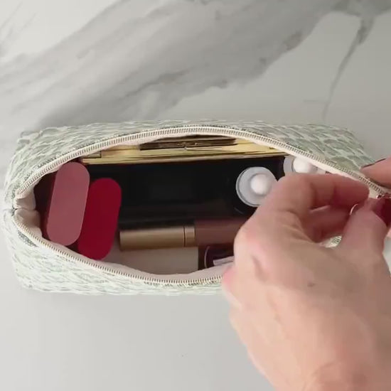 Generously sized quilted cosmetic bag keeps your items secure and organized. Handmade with quilted cotton canvas with a layer of batting making this a firm and structured bag. Use it for your cosmetic needs, travel toiletries, feminine products and hair and nail supplies.